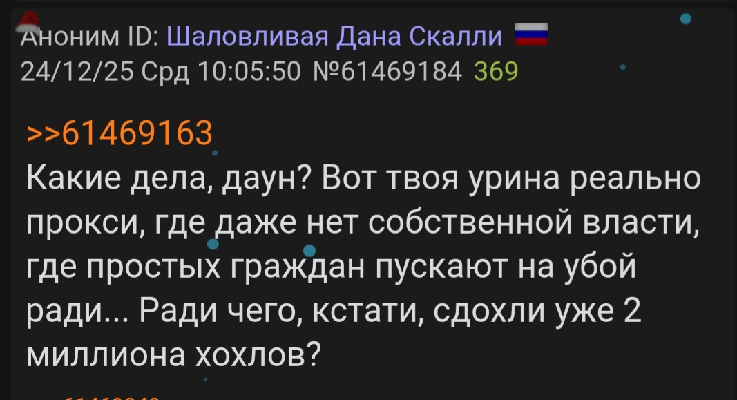 >>1279262 >В жопе ума нет. Хитрожопость это не ум. Как раз таки ум. Умение предвидеть плохие последствия и избежать их - это ум, ведь это помогает спасти себя. >А вот то, что у такого контингента нет ни морали, ни твёрдых убеждений,ни внутреннего стержня, это как бы неоспоримый факт. А почему он должен у них быть? Ты скозал? >А чо ты копротивляешься? Рыльце в пушку? Ну-ну. Как раз таки нет. У меня нет ни единого высказывания про СВО вообще, и позитивного в частности. Я через какое-то время сваливаю в США, так что предусмотрительно не оставлял подобной активности.