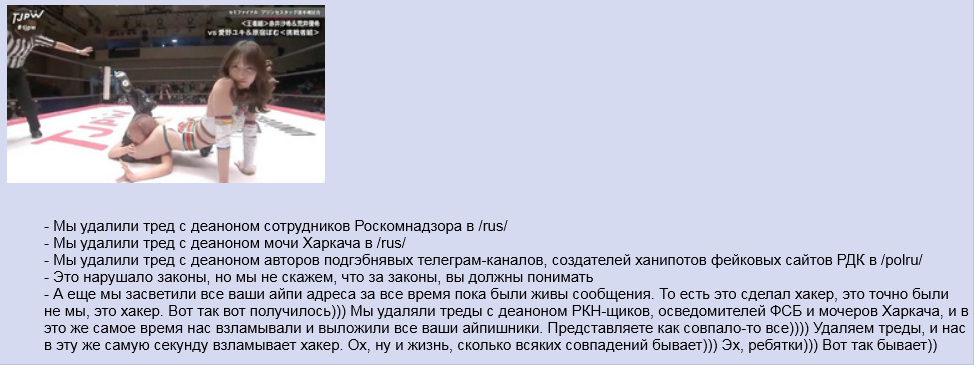 1. Эндчан был взломан. Не вдаваясь в детали, взломщик мог несколько часов пользоваться суперадминским режимом и видеть все IP всех постов на всех бордах. 2. Примерно в этот же момент главный админ удалил треды с деаноном сотрудников РКНа, с его слов - по запросу хостинг-провайдера.