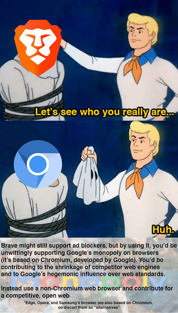 >>1076389 >Brave — это браузер-«рекламная платформа». «Sponsored Images» лезут в новый таб (каждый четвёртый по умолчанию), плюс свои Brave Ads за BAT-копейки. Ну вы поняли: «приватность, но с рекламой». Ты скозал? Тогда не удивительно, что ты высрал такую хуетень. >платный «браузерный VPN» за $9.99 в месяц. В Zen VPN не продают — ставь любой нормальный аддон или системный клиент и катайся. Троллинг тупостью? Будто в брейв невозможно поставить расширение ВПН'а. >«Ой, мы случайно подменили адреса партнёрскими рефами»: автодобавление аффилиаток к биржам и извинения постфактум. Обоссан в шапке треда. >Tor-окно» в Brave уже ловили на утечках .onion-запросов мимо Tor — фиксы выкатывали, но осадочек остался. Для анонимного серфинга лука существует Тор браузер, слыхал? Это, кстати, единственный не каловый браузер на геко. >Manifest V3 душит нормальные блокировщики на всём хромиуме. Нейробред.