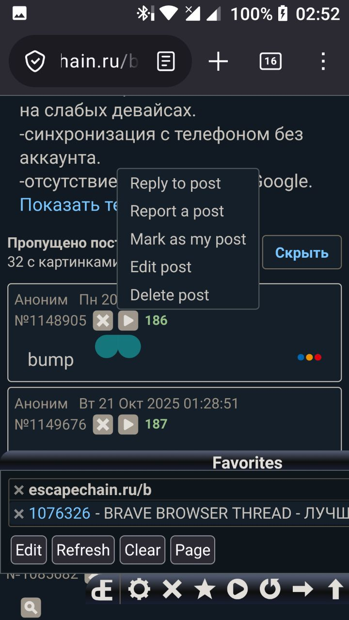 >>1076859 >Конечно. Я начал пользоваться Brave browser'ом с лета 2024 года и с тех пор это мой основной браузер. Bravechads keep winning! > один весьма большой и раздражающий недостаток: в нем нельзя установить свое фоновое изображение. Тут да, тоже не понимаю в чем причина не осуществления такой элементарной функции. Хотя у пиндоссов с реддита видел, что у них в мобильном брейве частенько меняются обои, в то время как у нас до сих пор висит какое-то море с камушками.