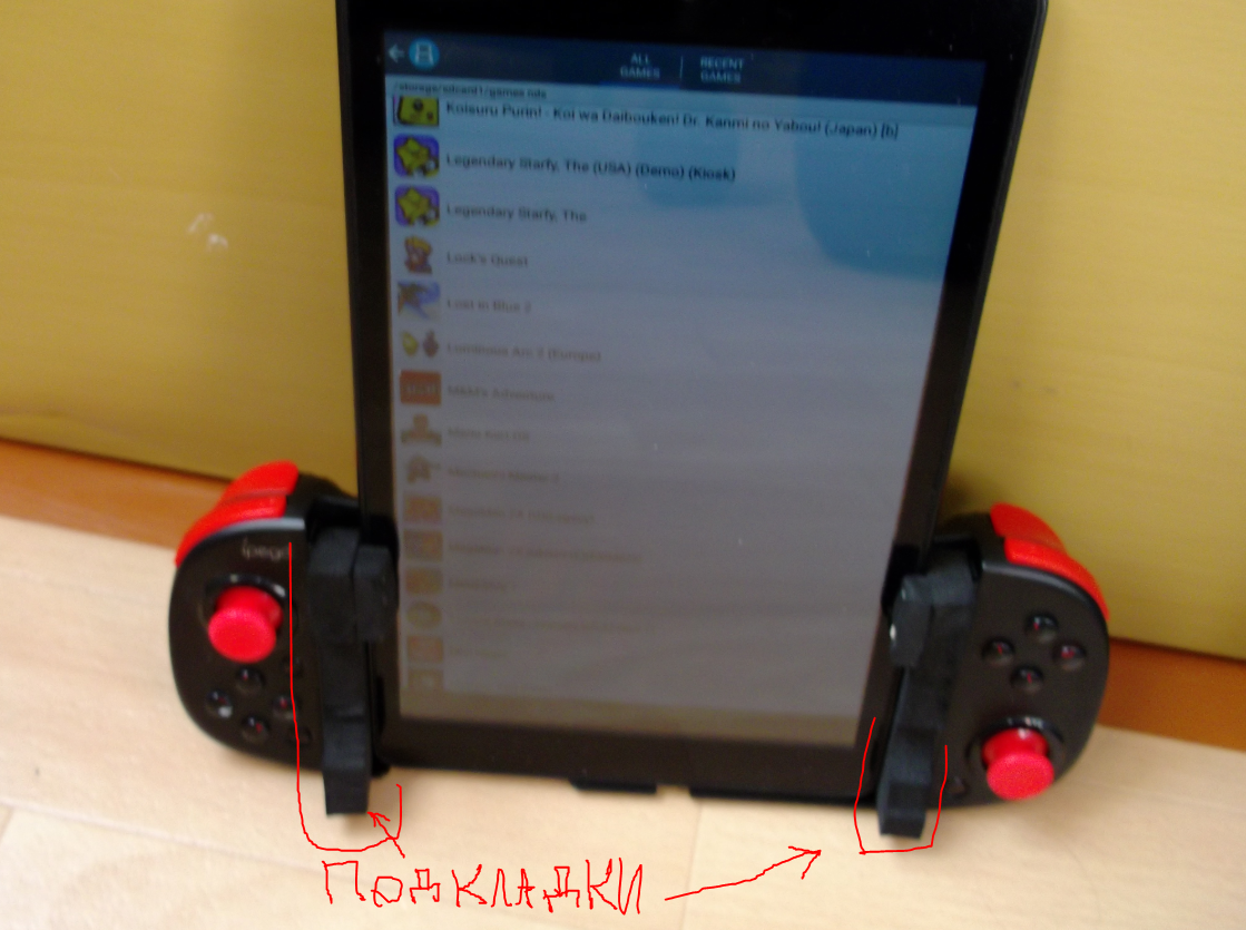 Так вот соорудив 2 подкладки по бокам из упаковки наушников мне удалось зафиксировать планшет вертикально, кажется планшету там буквально по половине сантиметра не хватало с 2-х сторон чтобы ухватить его условно в тиски держателя.... При эмуляции DS с нижним экраном можно взаимодействовать как с стилусом используя палец. Планшет если что старый на выброс на 5 ведроиде, задыхается от гугл хром или лисы, тупит, тормозит, но при этом игры норм эмулирует. Короче при покупке контролер держателя обратите внимание умещает ли он телефон не только горизонтально, но и вертикально. Конкретно указанный на фото контроле держатель умещает только телефон горизонтально, планшет не помещается, вертикально планшет с кустарными подкладками кое как полу-надежно можно закрепить. Чтобы уместить телефон вертикально в эту байду в моём случае я хз что придумать, если прокладки по бокам то очень широкий, не вариант. замутить какуе-то присоску, липучки, колхозинг-шаманиг в теории можно если очень захотеть, но проще было бы изначально рассчитать необходимые размеры для зажима и под них просто купить контролер-держатель который горизонтально и вертикально.