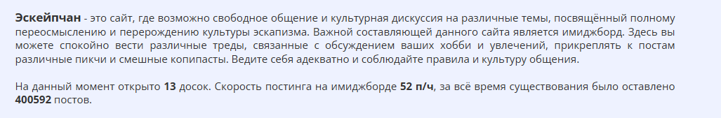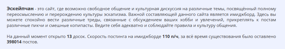 >>1162098 27.10.2025 На данный момент открыто 13 досок. Скорость постинга на имиджборде 52 п/ч, за всё время существования было оставлено 400591 постов.