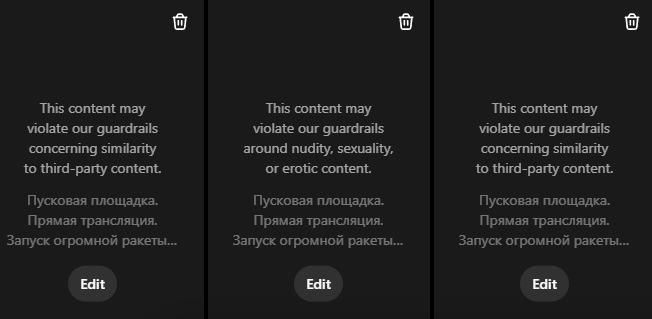 Как обойти цензуру? 1) Пробовать менять фразы, замещать "плохие слова" альтернативами и в целом экспериментировать с промптом. Описывать персонажей без личных имен чтобы не триггерить копирайт. 2) Роллить. Иногда из двух одинаковых реквестов подряд один цензуруется, а другой нет.