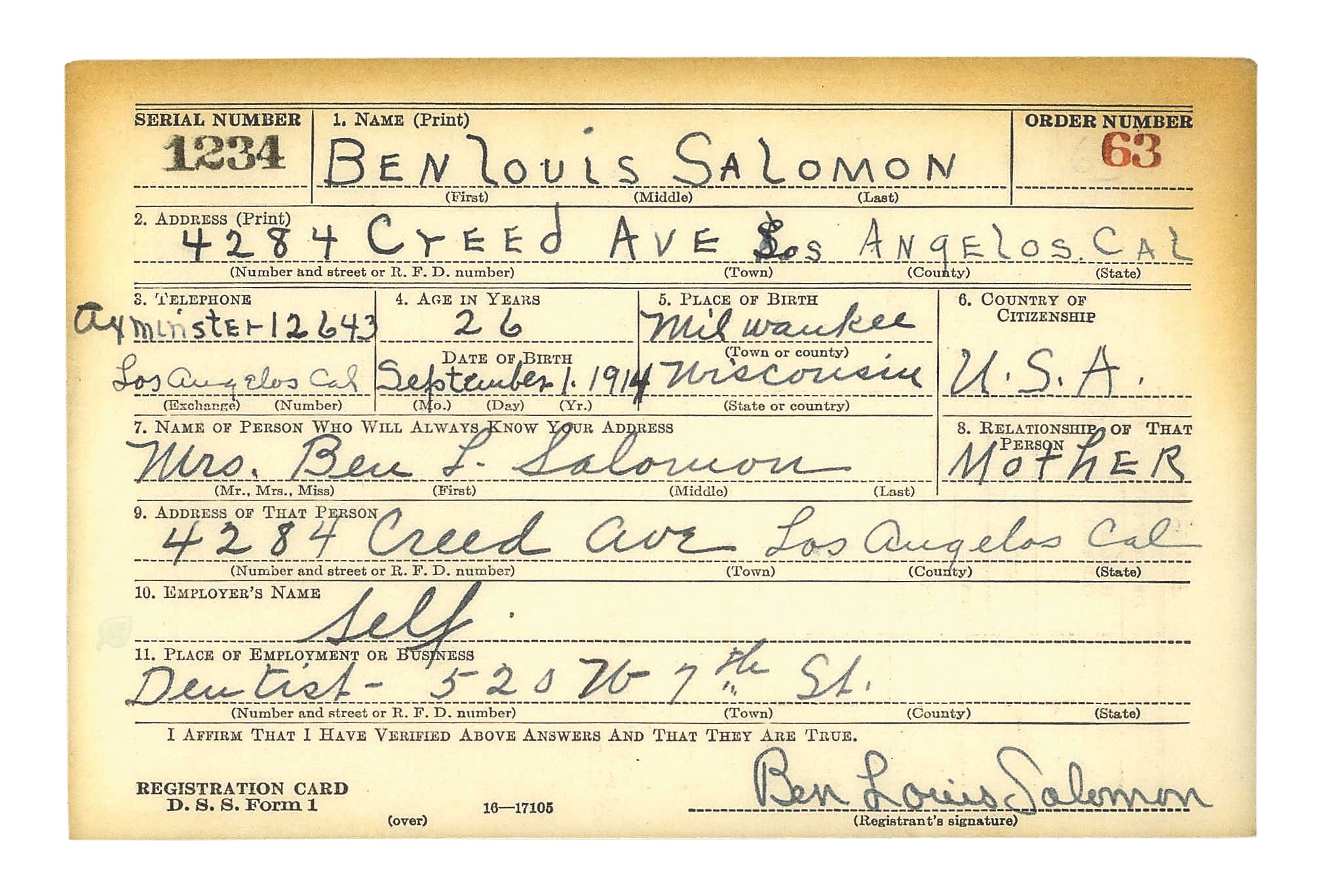 Осенью 1940 года начался призыв и Бен Саломон был в числе первых американцев, мобилизованных в соответствии с ним. Он начал службу рядовым пехоты. Присоединившись к 102-му пехотному полку, он зарекомендовал себя как высококлассный стрелок из винтовки и пистолета и в течение года был повышен в звании до сержанта, получив под начало пулемётную секцию (минимальную военную единицу, соответствующую отделению). В 1942 году, однако, было принято решение о переводе его в зубоврачебную службу армии. Саломон подавал заявление о желании остаться в пехоте, а его прямой командир обращался к начальству с рапортом о присвоении ему звания второго лейтенанта пехоты, но эти заявления были отклонены, и Саломон был отправлен на Гавайи, где получил звание первого лейтенанта медицинской службы.