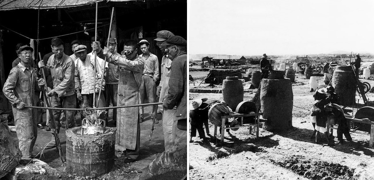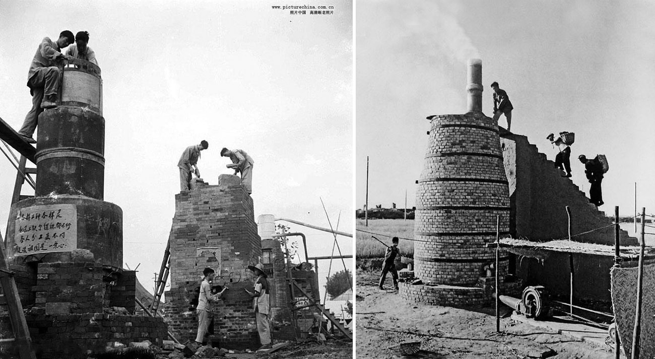 На заседании Политбюро ЦК в августе 1958 года приняли решение, что производство стали должно удваиваться каждый год. Для этого все коммуны в Китае должны строить печи для выплавки чугуна. По всей стране стали строиться печи из для плавки стали из руды. Печи делали сами и обогревали дровами, рабочих набирали из близлежащих деревень.