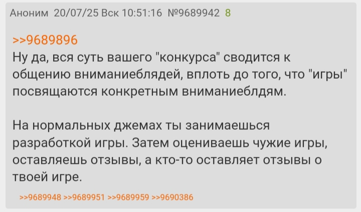 >>985854 Чел да не парься ты, игнорь сраных шизиков, пили игру для себя и для нормальных людей в судьях, а не для шизов каких то с раздела.