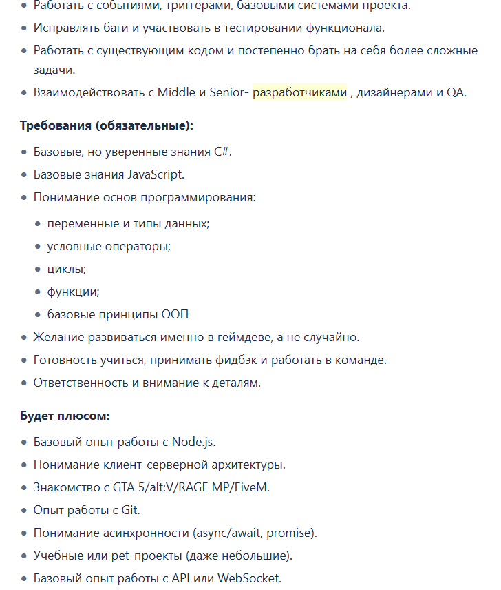 зачем вы обсуждаете зарплату джуна у какого-то гта 5 онлайн сервера? вы ебанутые? эта вакансия чисто опыт получить как реальный так и в трудовую и катиться куда-то дальше