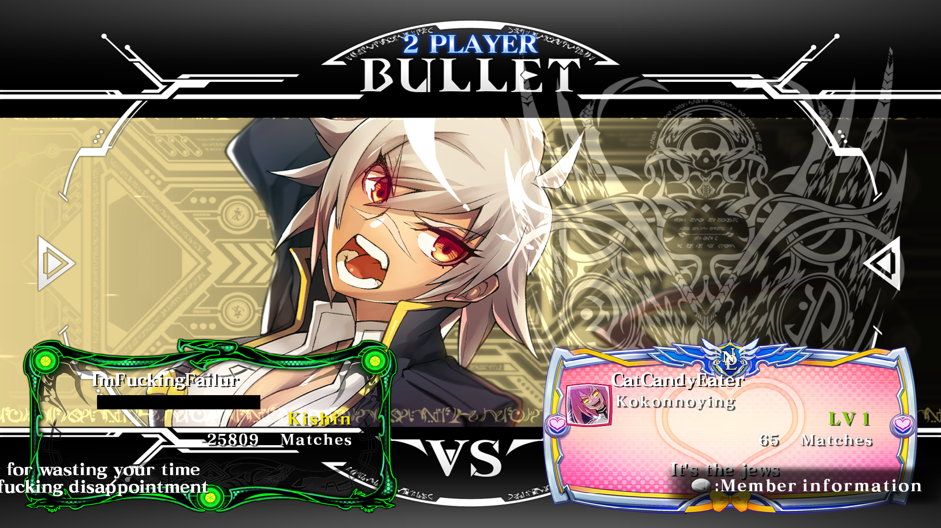 На самом деле это заставляет задуматься... Какое качество есть у задротов 3к+ игр, которых нет у меня и у тебя? Хотя у тебя 8к игр, но всё ещё этого нет. Хм... Эта Буллет меня победила 0-5, хотя я забирал раунды и был близок. И не сказать, что в плане комб у нас была такая уж большая разница. Да, у него был конфёрм, которого я не видел, плюс оказалось, что драйв можно использовать как оки, но в остальном разница не слишком велика. Но я всё равно помирал. Но почему... Наверное одна из причин, эта та, из-за которой ты нонстоп ныл, что я "перебиваю прессинг😭 😭 😭" своими 2А - неправильный стаггер прешшур у меня и тебя. Правильный прессинг это не долбёжка в блок, а удары с микропаузами, достаточными чтобы блок автоматически не ставился и попытка намешить приходилась в каунтер. У Буллет есть подходящая кнопка - 2Б. Если её немного оттягивать, то она контрит мэш и даблджамп, ударяя сразу после снятия блока. Но Буллет плоха в прессинге, да и как-то сложно приучить себя делать микропаузы в прессинге. А вторая причина это нейтрал. А тут вот хз. У Буллет очень плохой нейтрал, но он у меня универсально страдает как будто бы. Как будто есть более безопасные и разумные апроачи. Как будто бы ещё надо всегда блок держать - как когда бурстишь в рандомный абсолютно момент и оказывается, что чел каким-то образом посреди рандомного прессинга блок держал. Хм... Фундаменталы плохи...