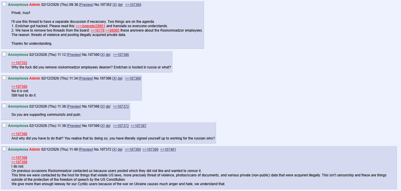 1. Эндчан был взломан. Не вдаваясь в детали, взломщик мог несколько часов пользоваться суперадминским режимом и видеть все IP всех постов на всех бордах. 2. Примерно в этот же момент главный админ удалил треды с деаноном сотрудников РКНа, с его слов - по запросу хостинг-провайдера.